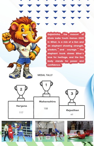 Gajasimha, the mascot of Khelo India Youth Games 2025 in Bihar, is a mix of a lion and an elephant showing strength, wisdom, and courage. The elephant trunk shows Bihar’s love for heritage, and the lion body stands for power and confidence. 69 69 69